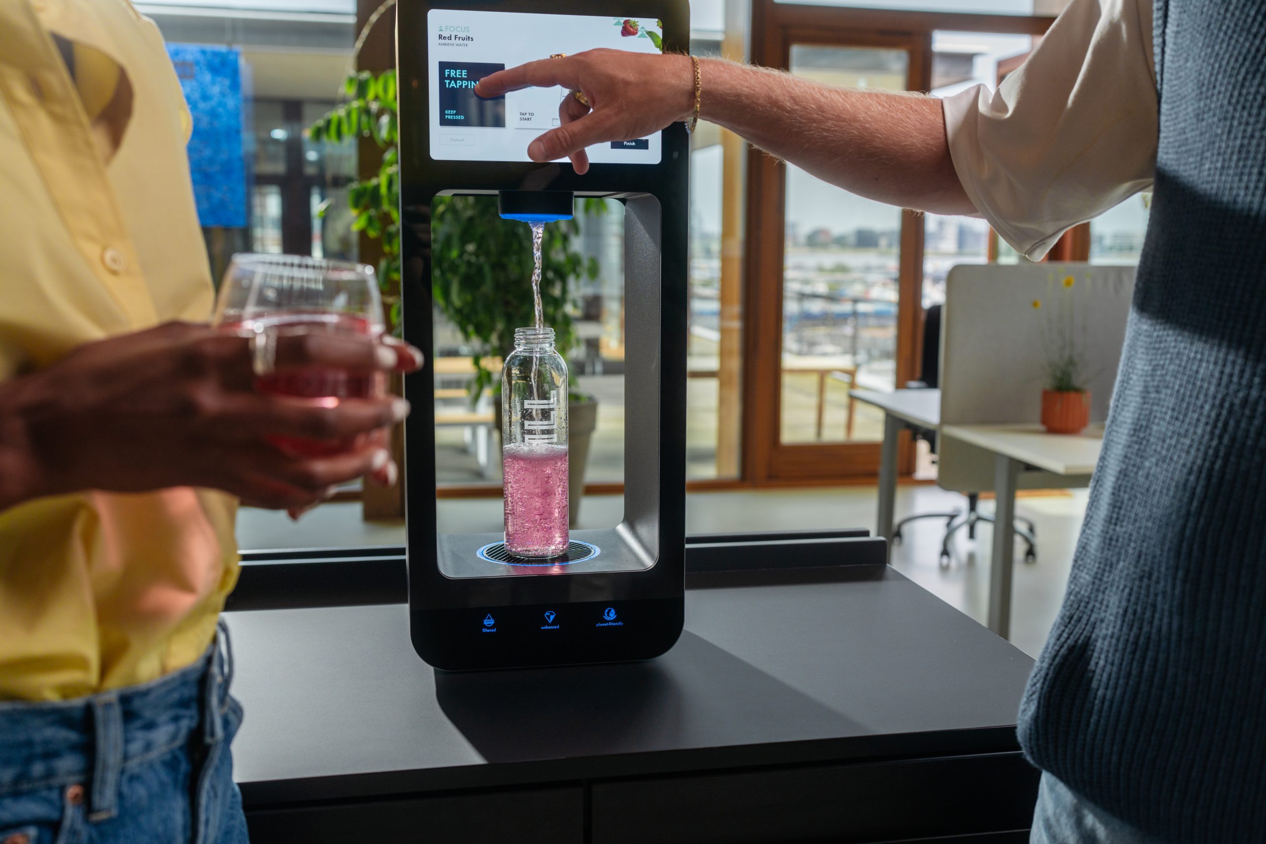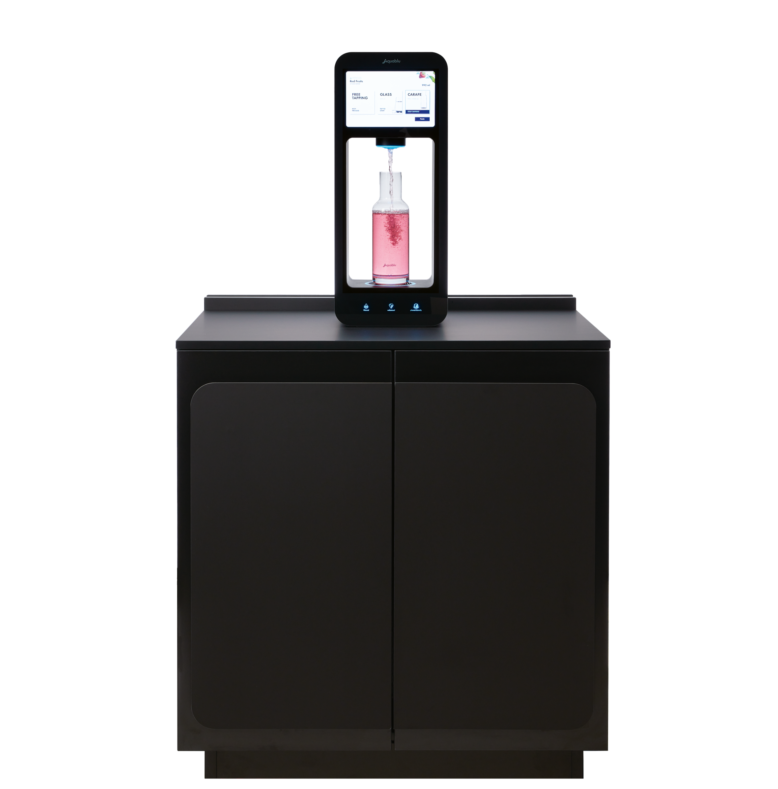 Der leitungsgebundene Wasserspender REFILL+ von Aquablu liefert auf Knopfdruck hochwertiges gekühltes, gefiltertes und aromatisiertes Wasser: still oder spritzig, angereichert mit Geschmacksrichtungen, Vitaminen und Elektrolyten. Mit zusätzlichen Anpassungen der Wassertemperatur und der Geschmacksintensität können Sie 39 verschiedene Getränke mit nur einem Gerät herstellen. Eine spezielle Düse schützt das System vor dem Eindringen mikrobieller Verunreinigungen. Der REFILL+ ist der optimale Wasserspender für Büros, Unternehmen und Fitnessstudios. Zudem besticht der moderne Wasserspender durch sein stilvolles Design und in seiner einfachen Bedienung. Wählen Sie simpel über den Touchscreen Ihr gewünschtes Aroma, den Kühlungsgrad Ihres Wassers und die Wassersorte - spritzig oder still.
